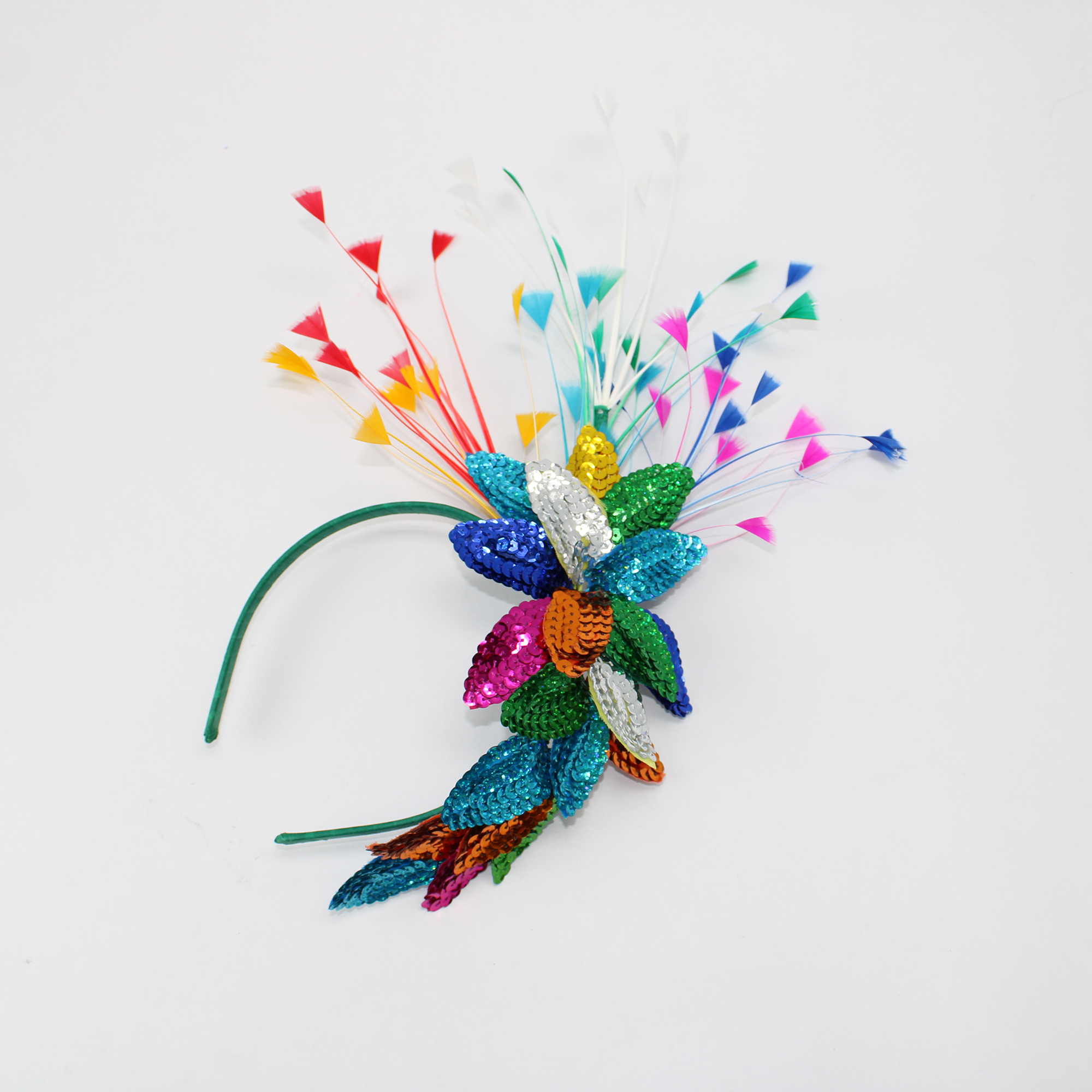 O arco possui um acabamento impecável, revestido em tecido verde para garantir conforto durante todo o uso. O destaque fica por conta do luxuoso arranjo floral feito inteiramente de paetês brilhantes em uma mistura vibrante de cores: azul, verde, rosa, laranja, prata e dourado. Para completar, delicadas penas coloridas (vermelho, amarelo, azul, verde e branco) trazem movimento e leveza à peça.