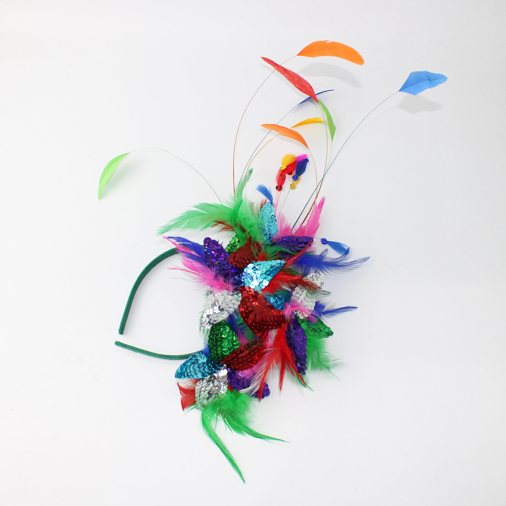 O arco é revestido para garantir conforto durante o uso prolongado, enquanto o arranjo superior simula flores estilizadas com lantejoulas vibrantes e acabamento em penas alongadas que dão altura e movimento à peça. É o toque final ideal para blocos de rua, bailes e festas temáticas.