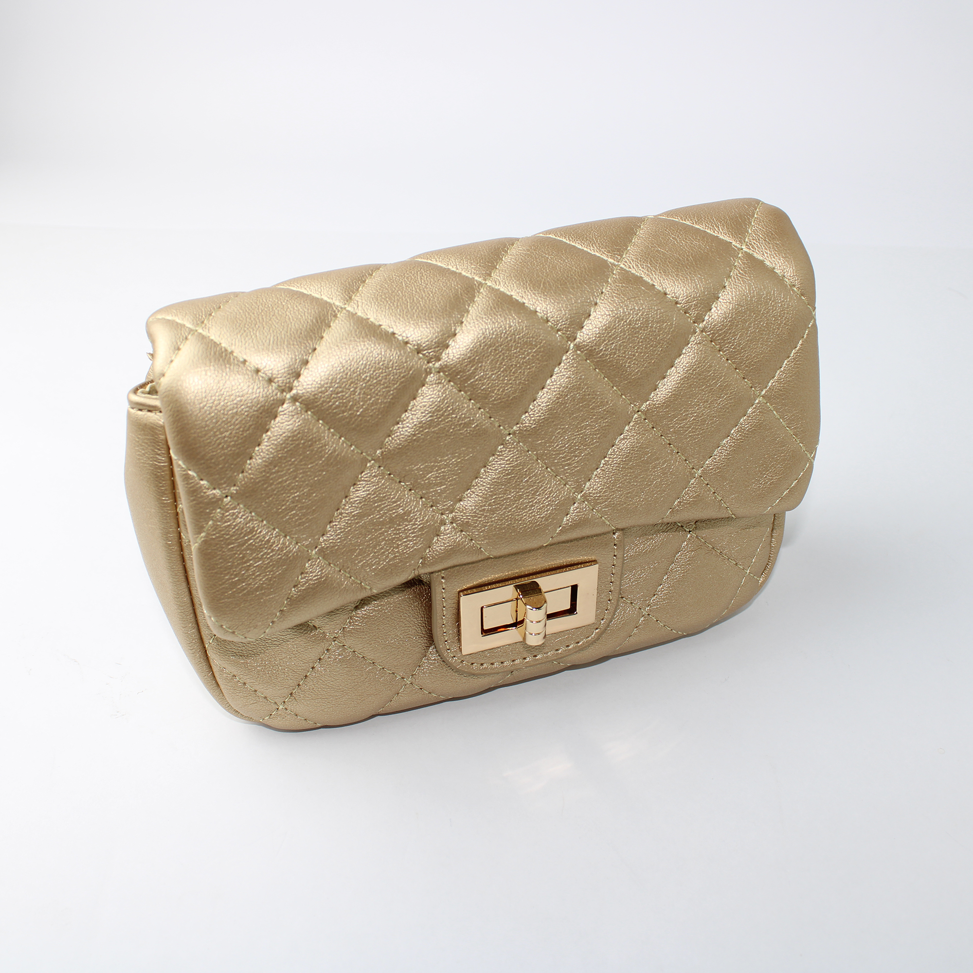Eleve a sofisticação do seu visual com a Bolsa Metal Matelassê. Este acessório é a definição de glamour, apresentando um acabamento metalizado impecável que destaca a textura clássica do acolchoado em losangos.