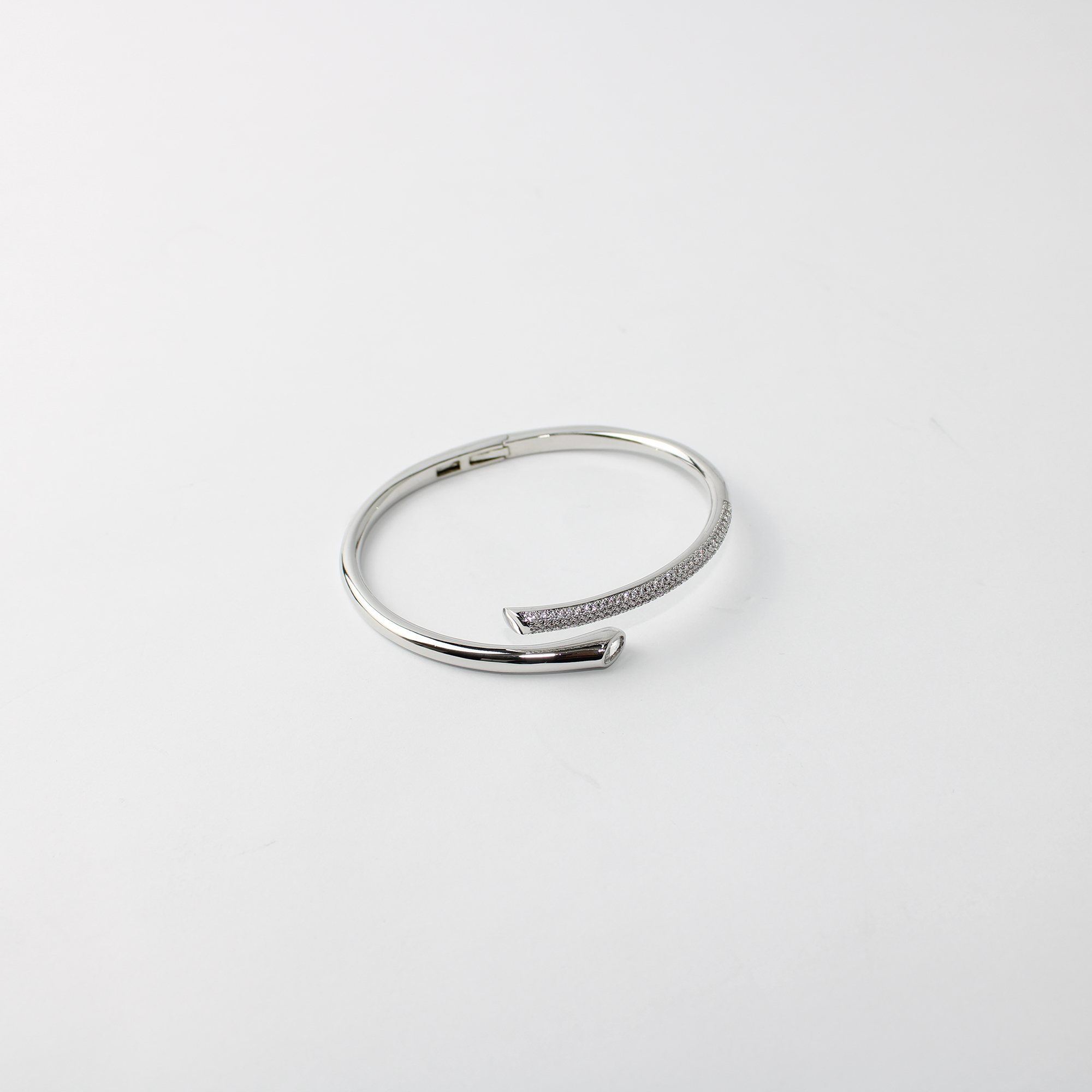 O grande destaque desta peça é a sua extremidade delicadamente cravejada com microzircônias cristais, que garantem um ponto de luz refinado e luxuoso. A estrutura rígida conta com um fecho lateral discreto e seguro, facilitando o uso e proporcionando um ajuste confortável.