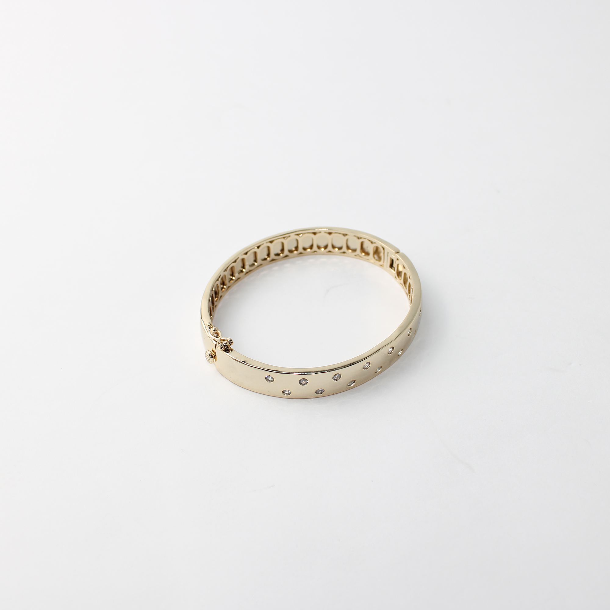 O Bracelete de Metal Polido é a definição de elegância contemporânea e minimalista. Esta peça apresenta uma superfície dourada de alto brilho, estrategicamente adornada com pequenos cristais incrustados que criam um efeito de "pontos de luz", garantindo um brilho sutil e sofisticado ao pulso.