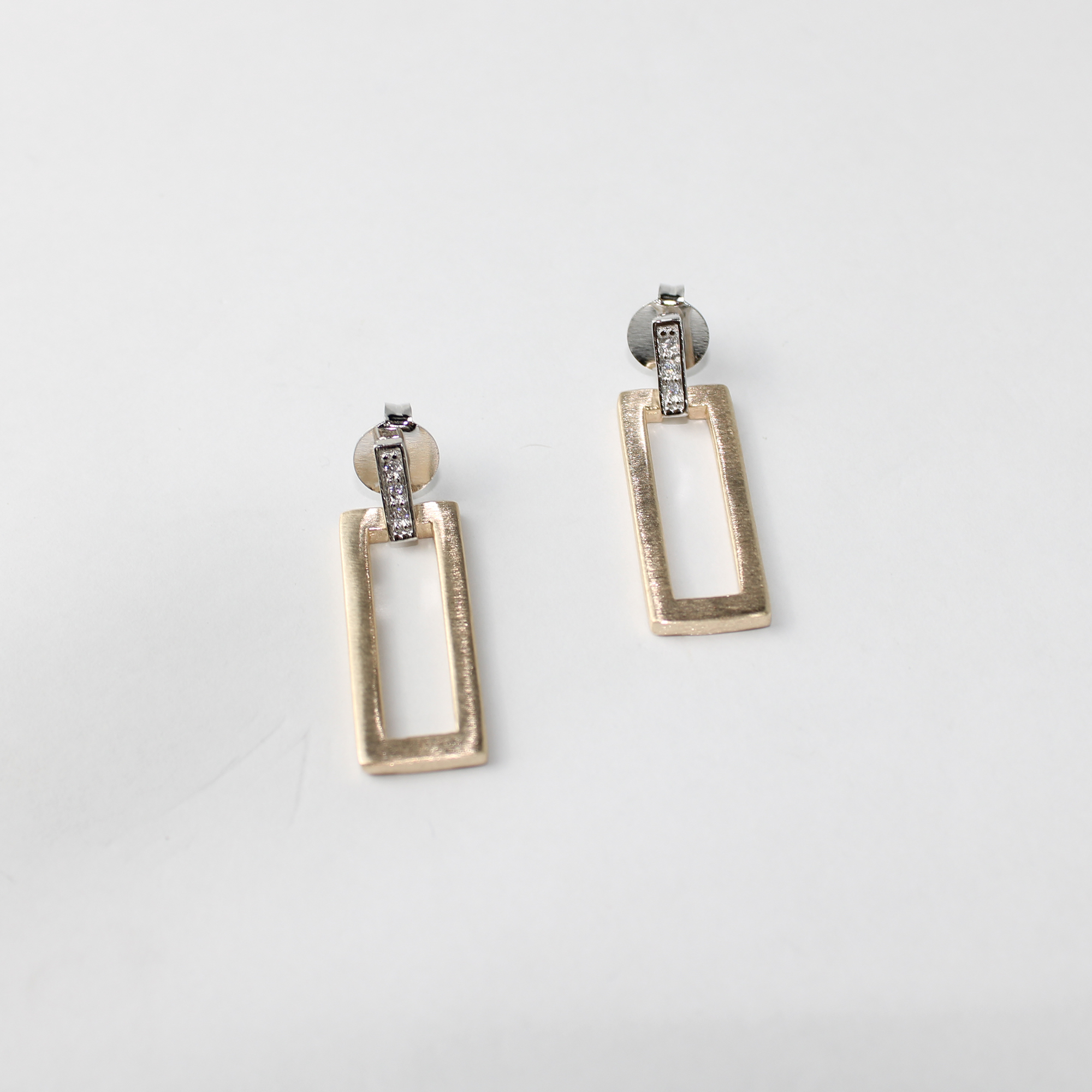 O brinco folheado vazado retangular com cristais traz um toque moderno e sofisticado ao visual. Seu design geométrico em formato de retângulo combina o acabamento fosco com o brilho sutil dos cristais, criando uma peça equilibrada entre elegância e estilo contemporâneo.