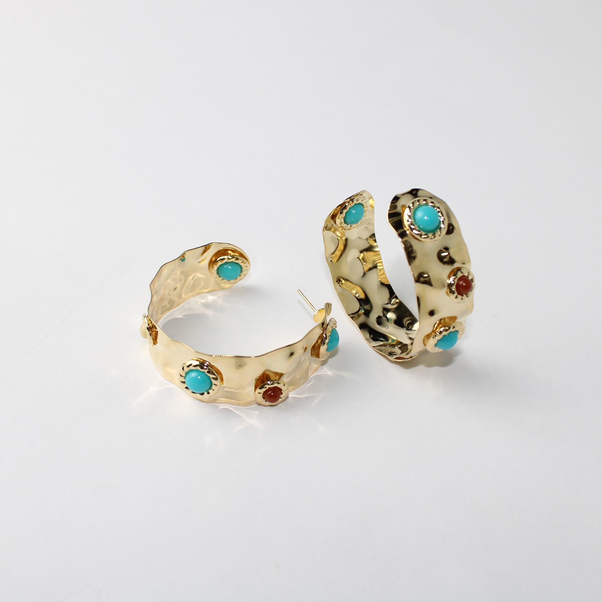 As aplicações de pedras coloridas em tons de turquesa e âmbar adicionam um toque vibrante, tornando o brinco ainda mais estiloso e versátil para diversas produções. Também disponível em outras cores, permitindo ampliar suas combinações.
