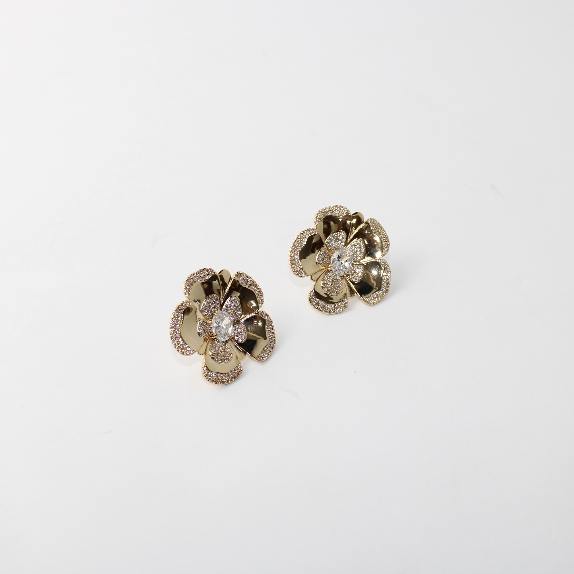 O centro da flor é coroado por uma pedra central que garante um ponto de luz intenso, valorizando o rosto com elegância e distinção. Seu acabamento refinado em tom dourado torna-o o acessório indispensável para festas, casamentos ou para elevar uma produção casual chic ao nível da alta joalheria.