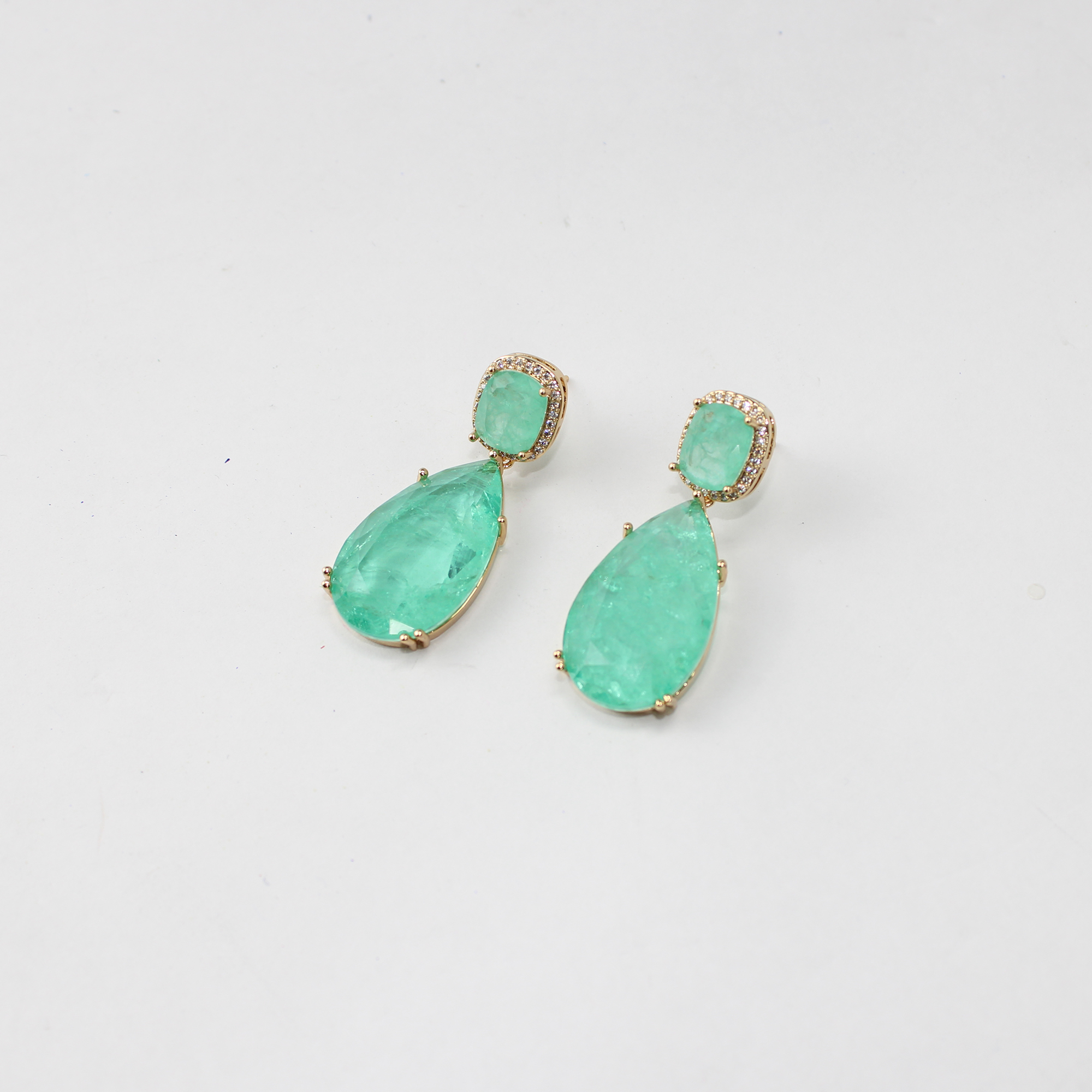 Com um acabamento dourado impecável, o brinco destaca-se pela sua pedra principal em formato de gota na cor verde, que remete à beleza das esmeraldas. A base superior, em formato geométrico arredondado, é delicadamente cravejada com micro zircônias cristal, proporcionando um brilho sutil e luxuoso que ilumina o rosto.