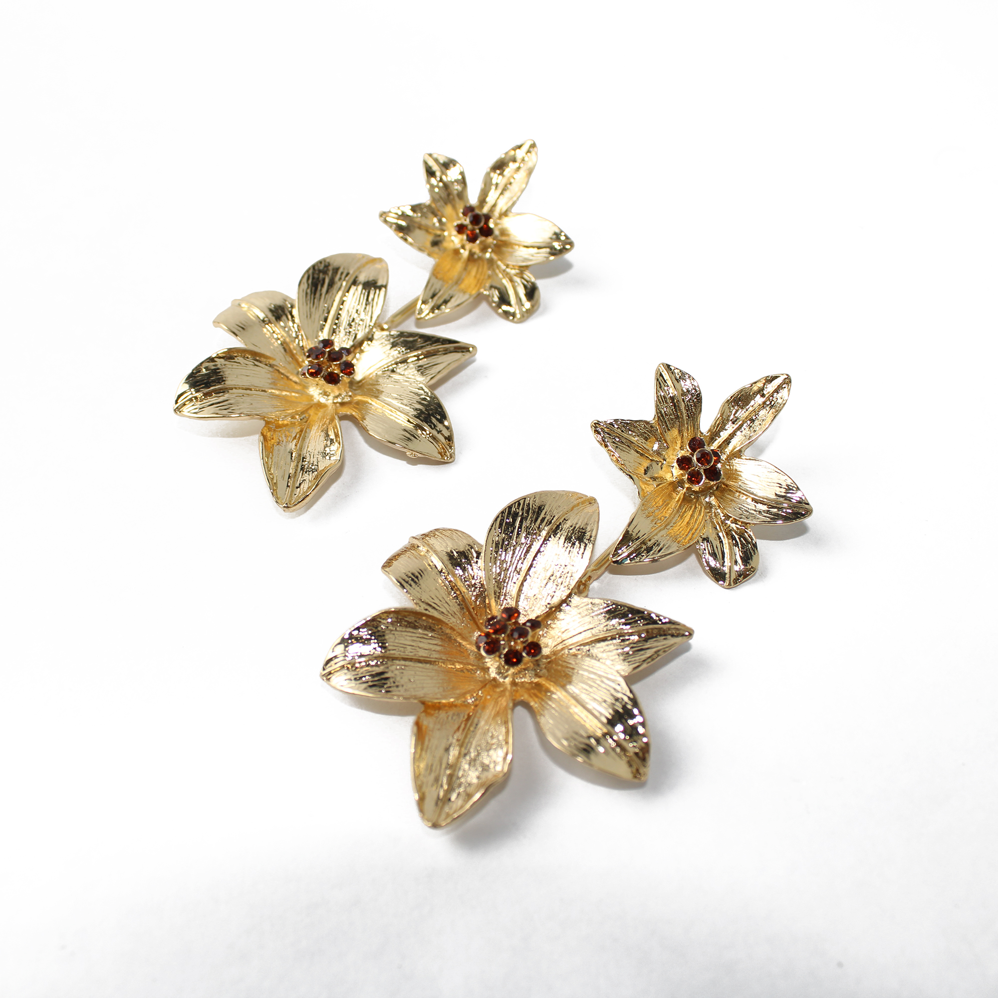 O centro de cada flor é iluminado por pequenos cristais na cor âmbar, proporcionando um brilho quente e luxuoso. É o acessório ideal para quem busca destacar-se em festas e ocasiões especiais com feminilidade e estilo.