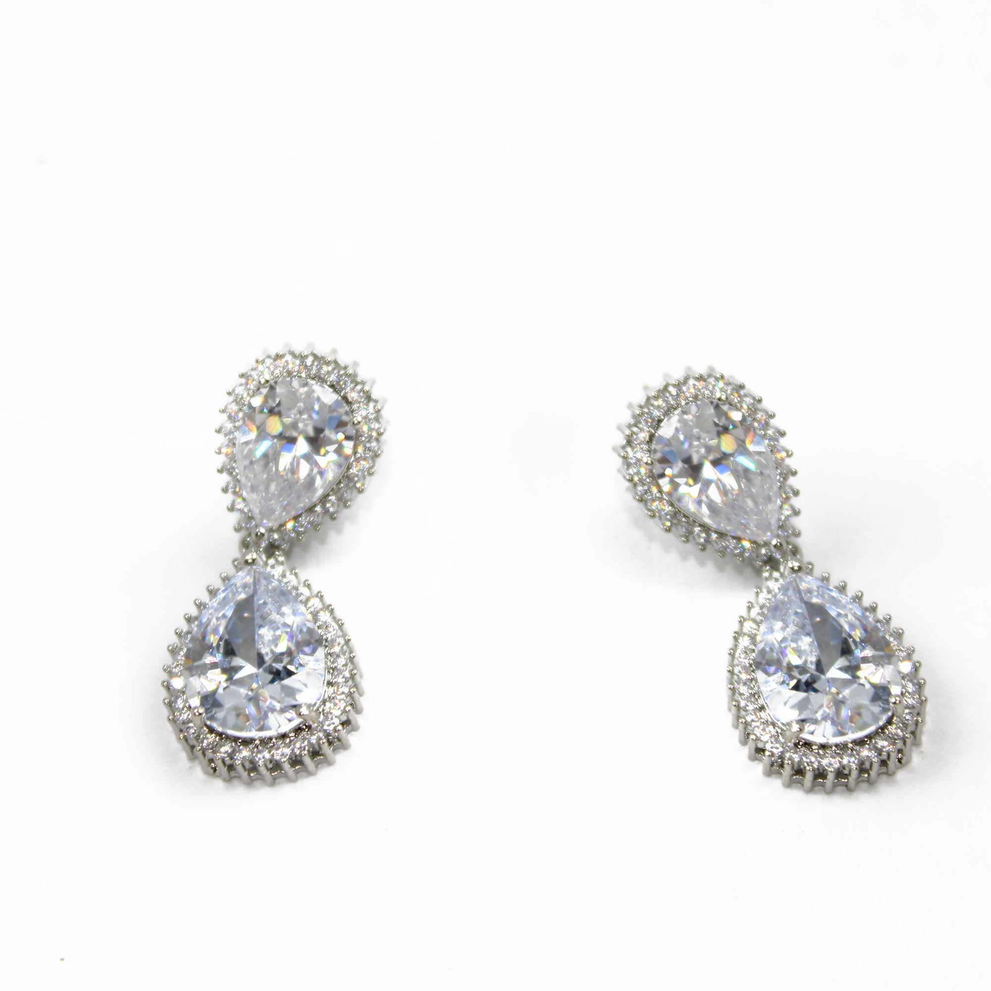 O design apresenta uma estrutura de gota dupla, onde pedras de Zircônia Cristal de alta pureza são as protagonistas. Cada pedra central é cuidadosamente envolta por um halo de micro zircônias cravejadas, criando uma moldura luminosa que amplia o brilho e confere um acabamento de alta joalheria. O banho prateado harmoniza perfeitamente com a transparência dos cristais, tornando este brinco a escolha ideal para noivas, madrinhas e eventos de gala.