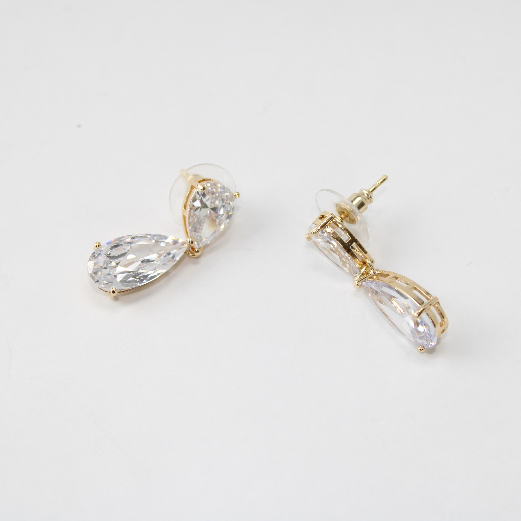 O design apresenta uma composição harmoniosa com duas zircônias de alta qualidade lapidadas em formato de gota: uma menor na base fixa e outra maior pendente, criando um movimento sutil e gracioso. A transparência cristalina das pedras reflete a luz com intensidade, iluminando o rosto com um charme discreto e luxuoso.