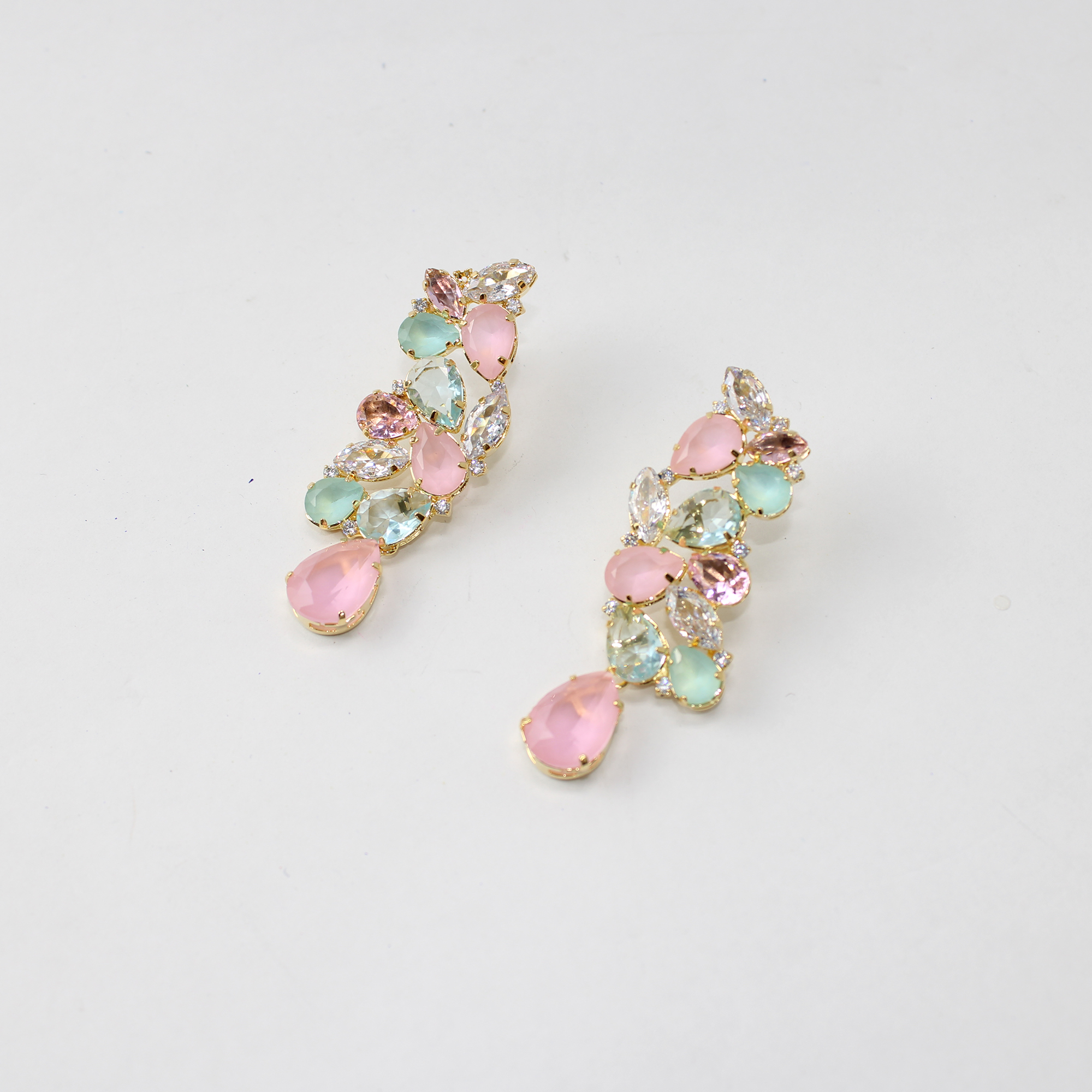 Com um design elaborado, o brinco combina a nobreza do metal com o brilho intenso das zircônias e pedras coloridas. A lapidação cuidadosa das gemas reflete a luz de forma espetacular, garantindo um visual iluminado e elegante. Seja no modelo gota clássico ou nos designs mais orgânicos com mix de pedras (como a variação Rosa/Verde), esta semijoia é perfeita para ocasiões especiais.