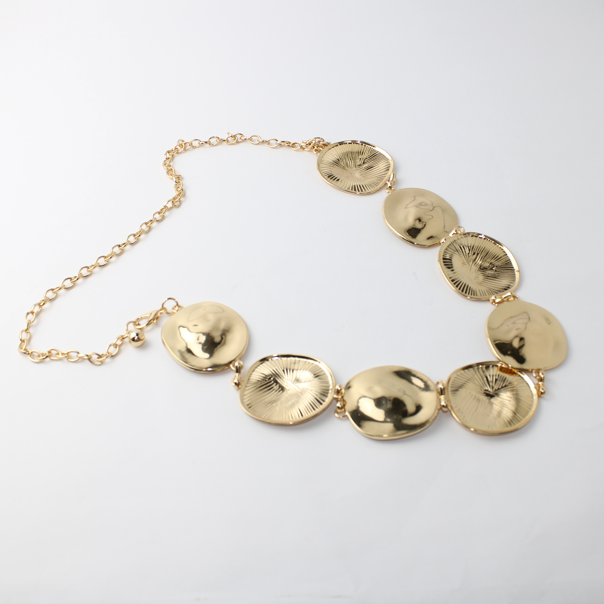 O Cinto de Metal com Placas é a peça-chave para transformar produções básicas em looks de alto impacto. Composto por uma sequência de placas circulares que alternam harmoniosamente entre o acabamento polido espelhado e o texturizado, este acessório exala modernidade e sofisticação.