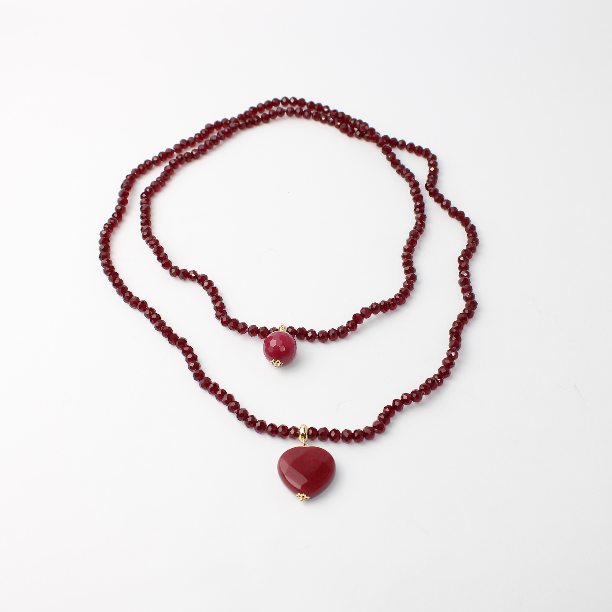 O grande destaque desta peça são os seus pingentes: uma esfera de cristal facetada e um encantador coração central, ambos em tom vermelho vibrante, que conferem um toque de personalidade e paixão ao visual. O acabamento em metal dourado dos detalhes garante a durabilidade e o luxo que você merece.