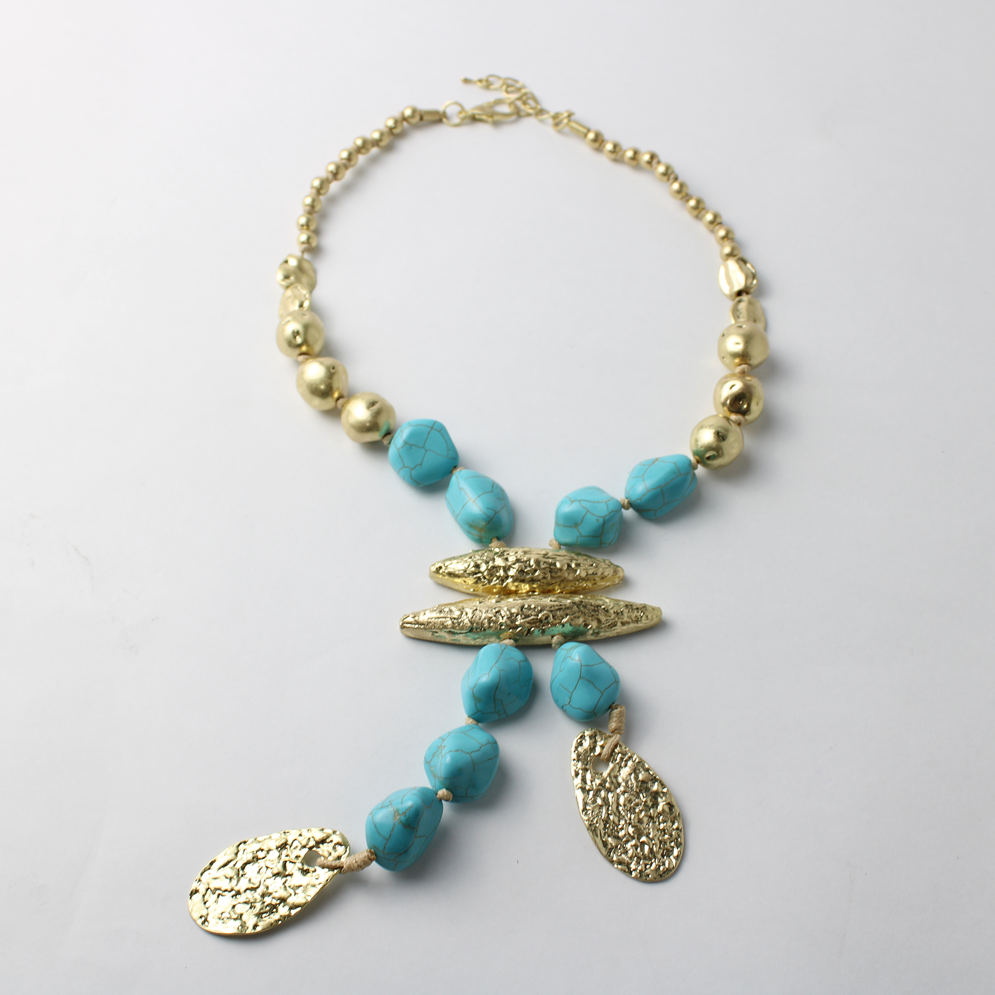O Colar Metal Curto com Pedras Turquesa é uma peça marcante e sofisticada que une o brilho metálico ao charme natural das pedras turquesa. Seu design combina esferas metálicas com pedras em formato orgânico e pingentes texturizados, criando um visual moderno e elegante.