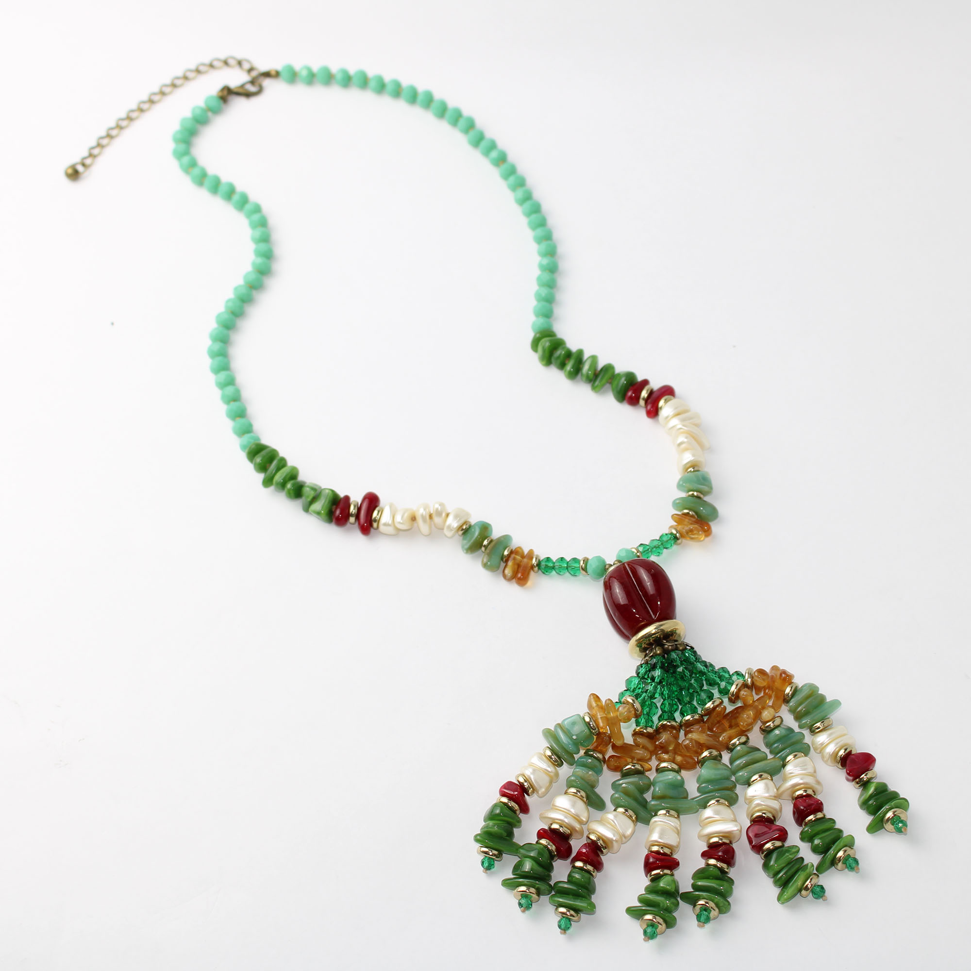 • Contas de pérola e pingentes metálicos