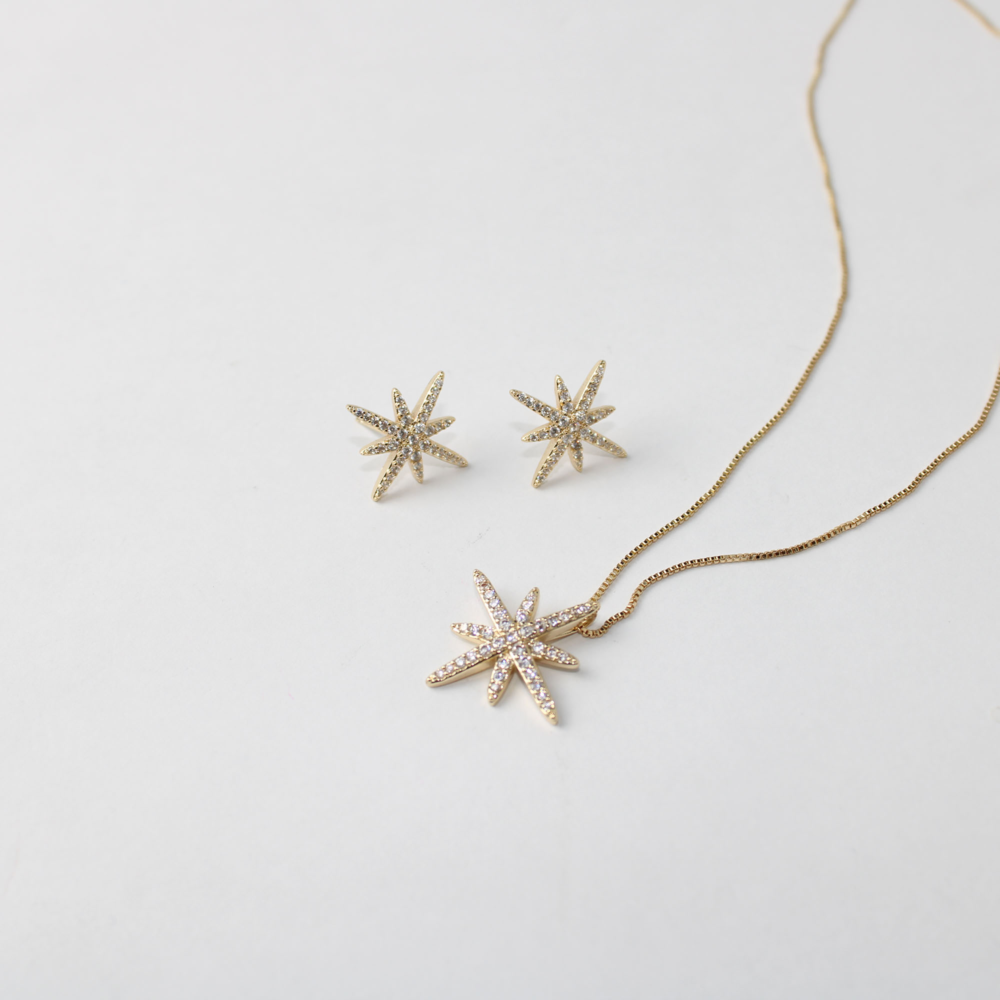 Disponível no tamanho **G**, este conjunto é a escolha perfeita para adicionar um toque de glamour celestial a looks de festa, jantares especiais ou para elevar sua produção do dia a dia. Seu design moderno e sofisticado é ideal para quem ama joias delicadas com grande impacto visual.