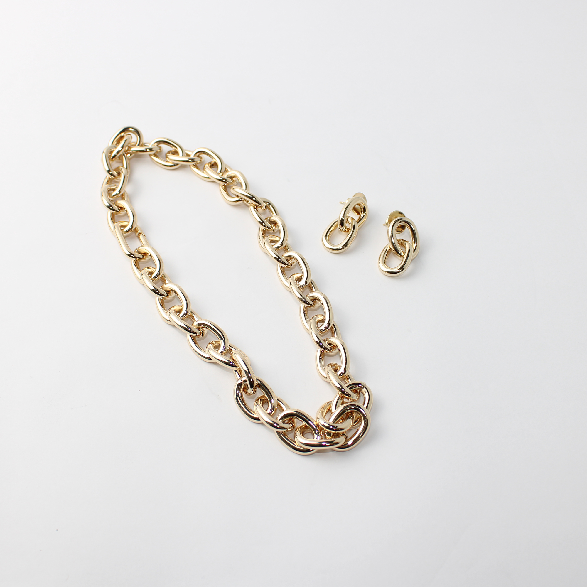 O Conjunto de Metal Elos é a escolha definitiva para quem deseja aderir à tendência da correntaria com máxima sofisticação. Este kit exclusivo é composto por um colar de elos ovais robustos e brincos que seguem o mesmo design harmônico, criando um visual coordenado e de alto impacto.
