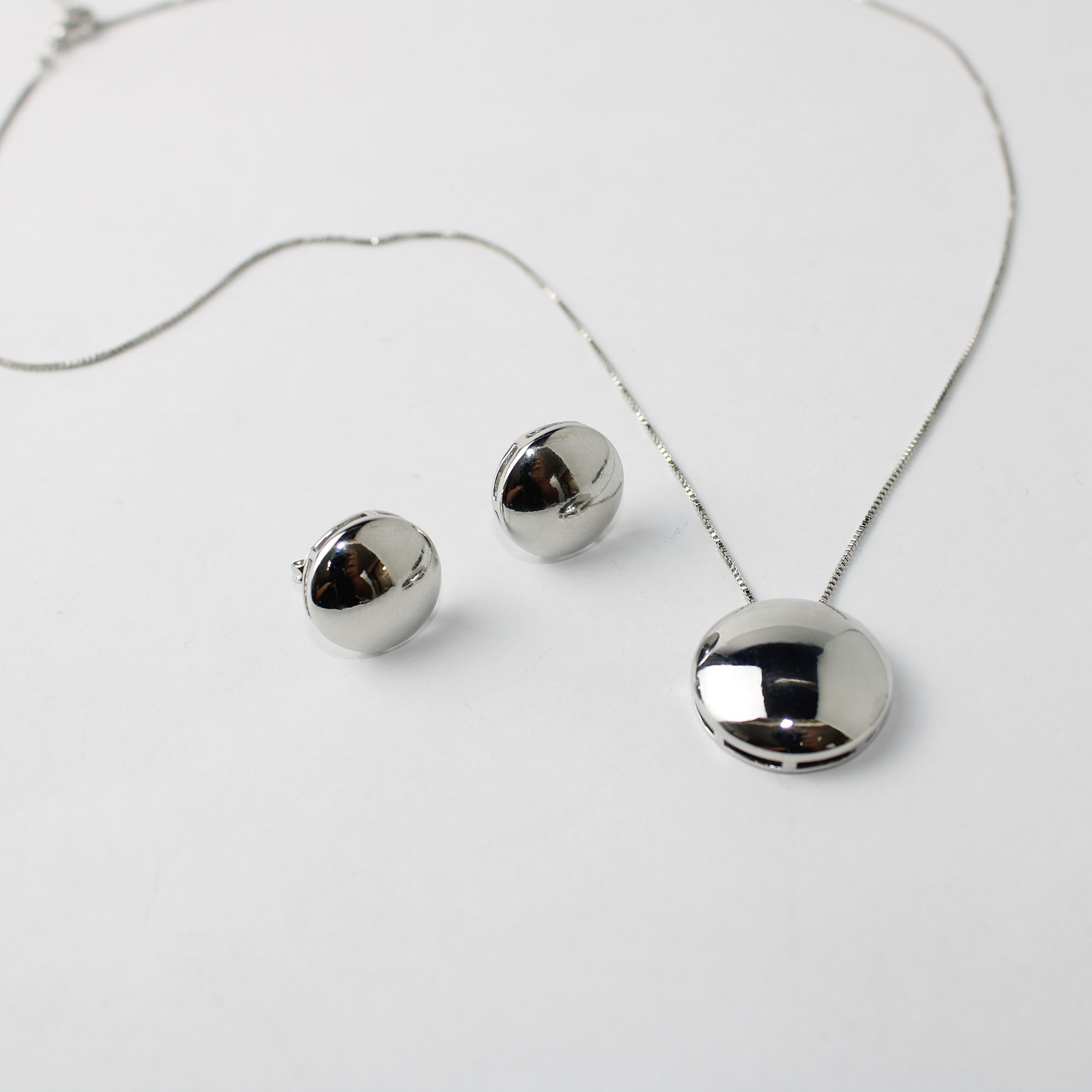Aposte na elegância minimalista com o **Conjunto Colar e Brincos Redondo Liso em Metal**. Este conjunto traz um design moderno e clean, composto por um colar com pingente circular e brincos de pino no mesmo formato esférico, ambos com acabamento liso e polido, que reflete a luz de forma sutil e sofisticada.