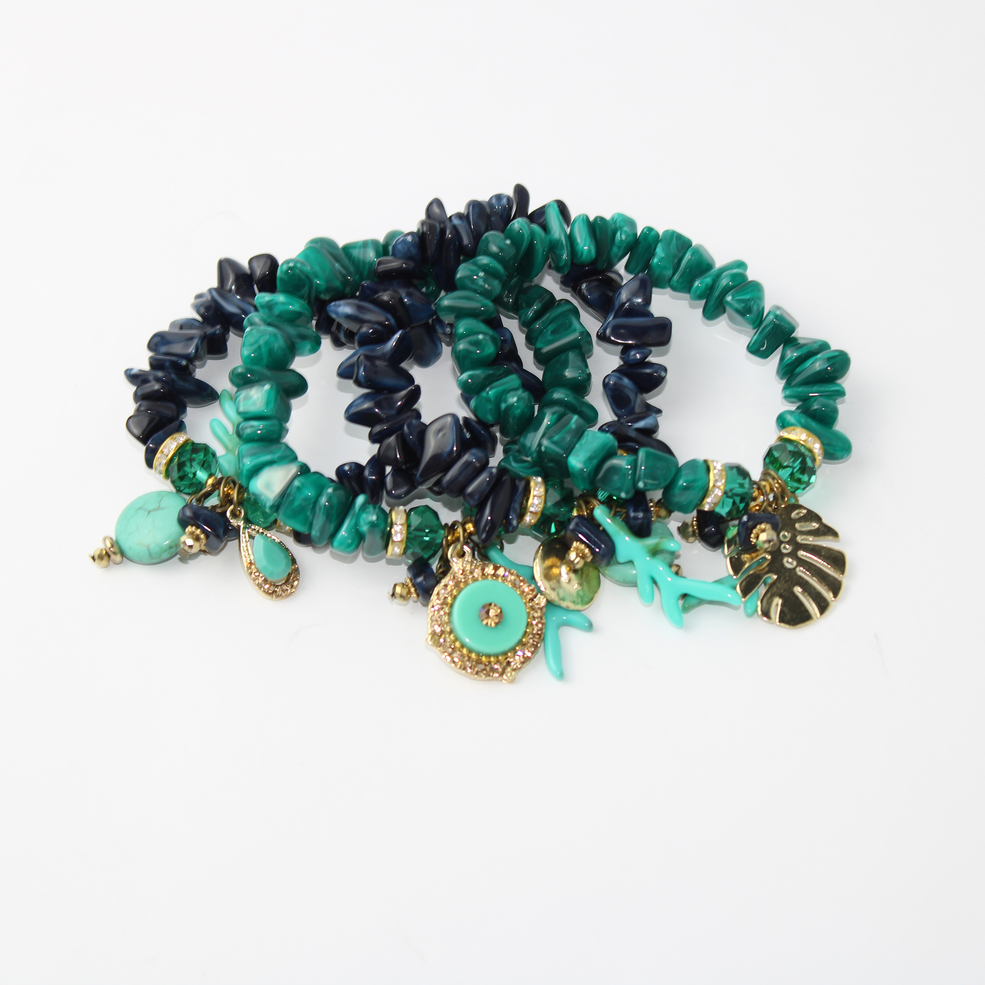 As pulseiras possuem base elástica de alta resistência, garantindo praticidade e um ajuste confortável ao pulso sem a necessidade de fechos. Os pingentes, que incluem elementos inspirados na natureza como corais e folhas, conferem um charme extra e um ar boho chic irresistível à composição.
