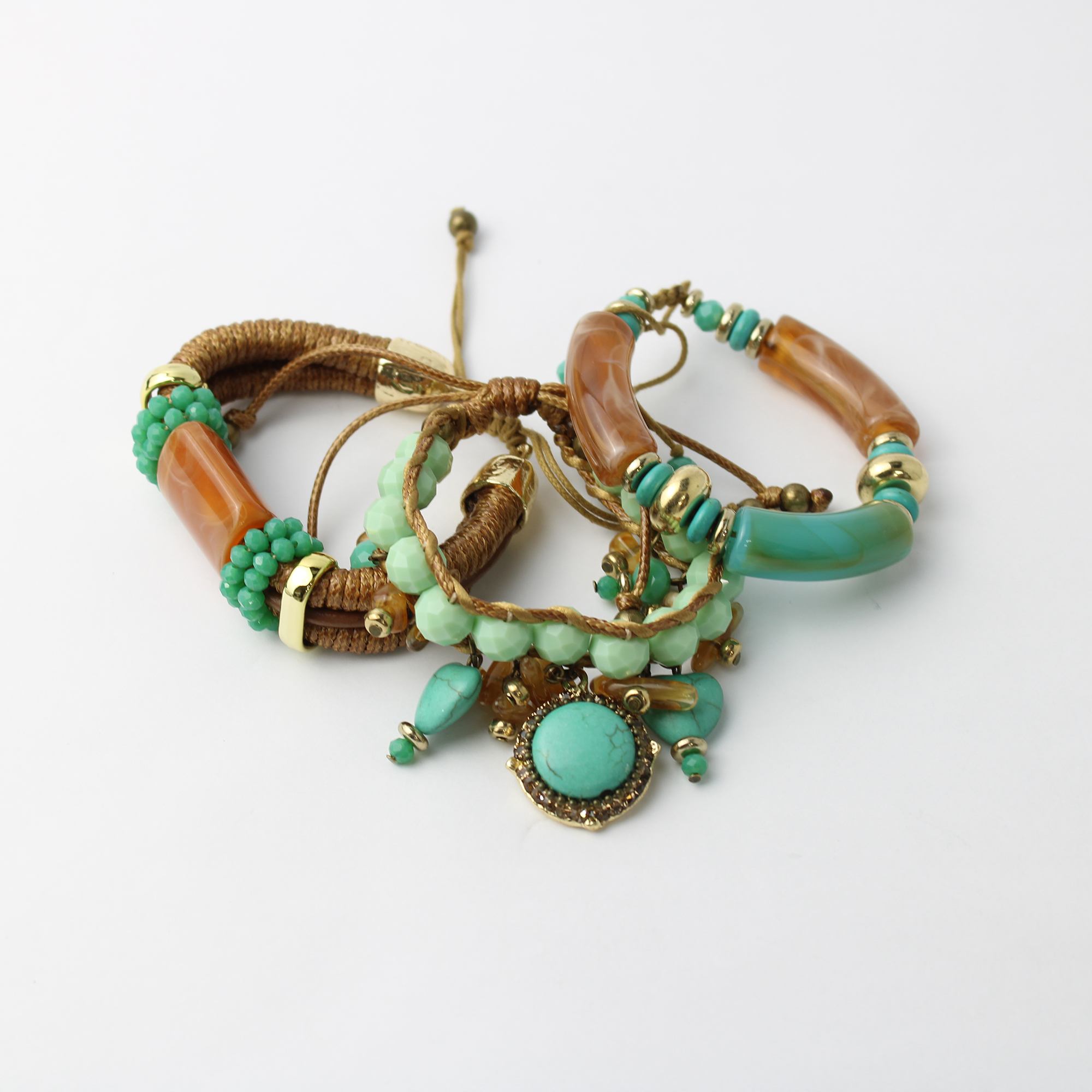 As pulseiras apresentam uma rica combinação de materiais, incluindo elementos em resina polida, contas facetadas e cordões trançados de alta qualidade. O destaque principal são os pingentes de pedra turquesa e os detalhes em metal dourado, que conferem um brilho rústico e elegante ao mix.