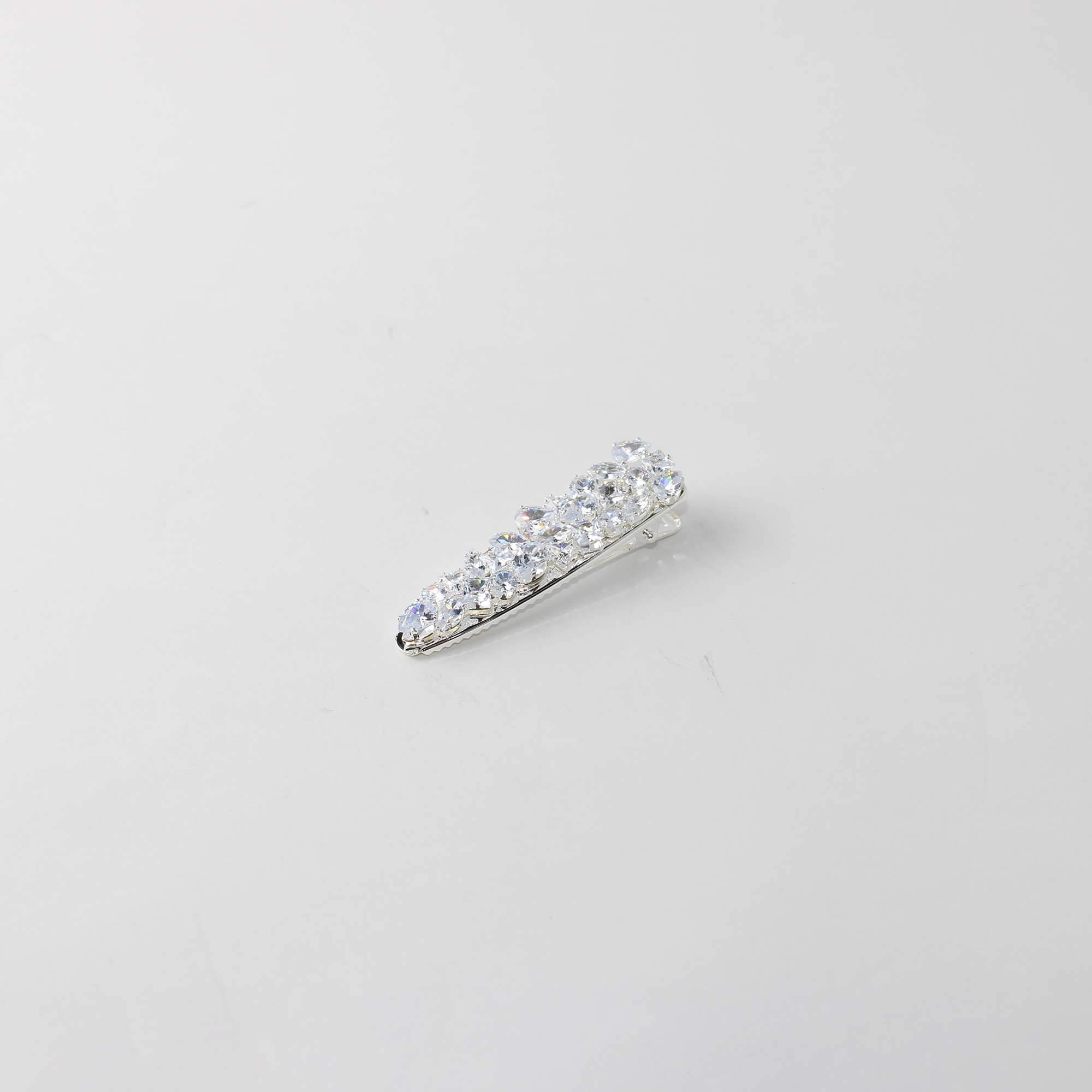 Com um design em estilo bico de pato, ele oferece uma fixação precisa e segura, sendo ideal para finalizar penteados elaborados ou dar um toque de glamour imediato ao cabelo solto. Sua estrutura em metal prateado garante durabilidade e um acabamento refinado que não passa despercebido.