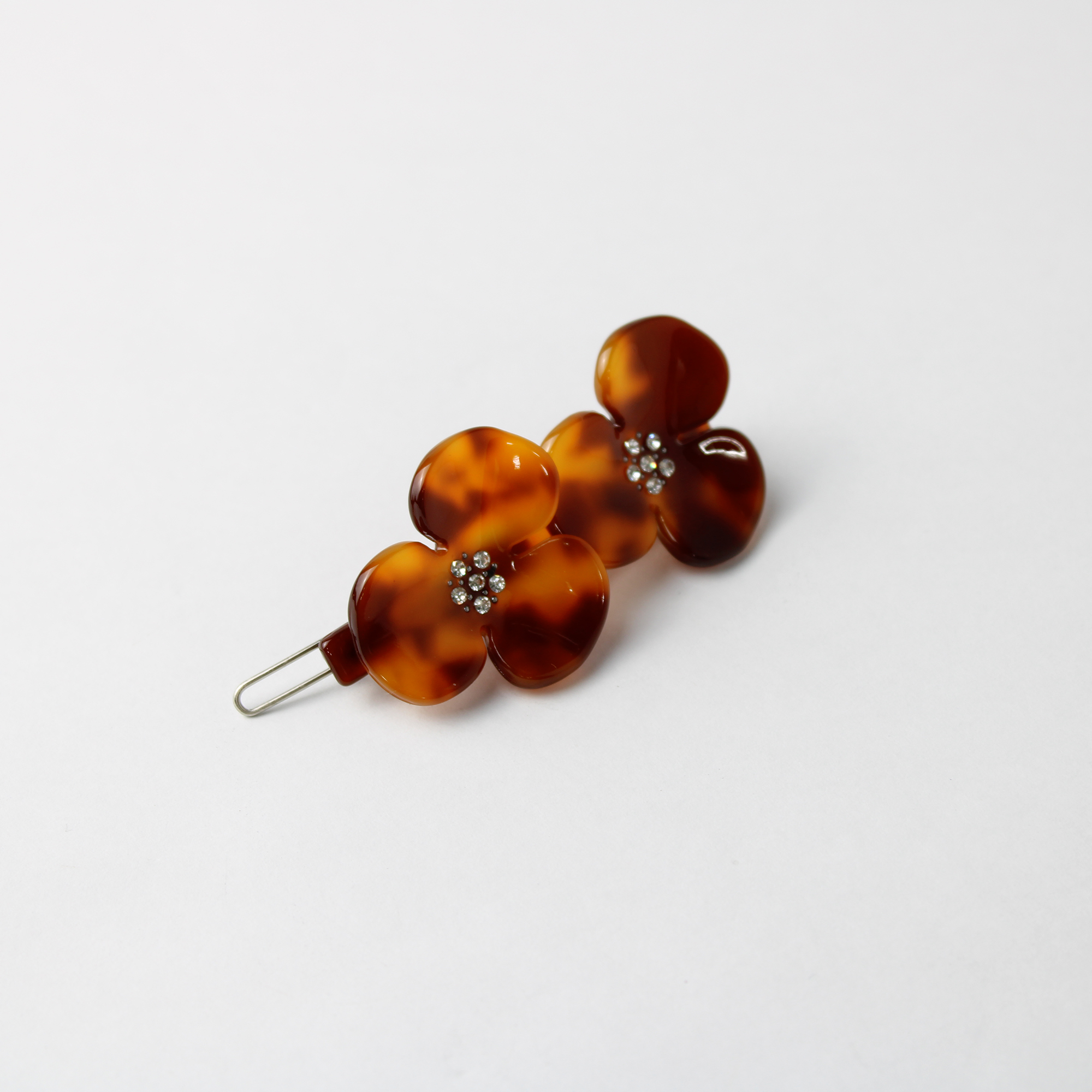 Com acabamento em resina na cor tartaruga e detalhes em strass no centro das flores, ele traz brilho e charme na medida certa.