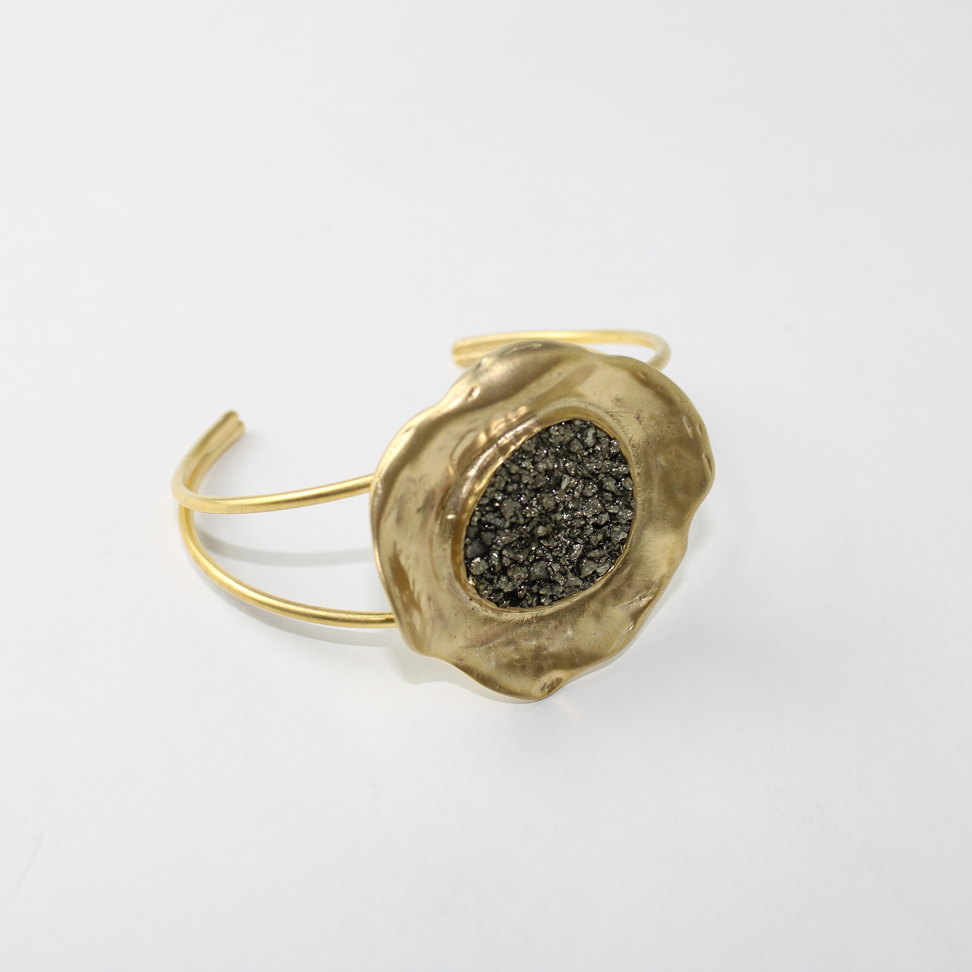 A Pulseira Metal Bracelete é uma peça moderna com design artístico, combinando o acabamento dourado com detalhe central fumê texturizado que traz sofisticação e personalidade ao visual.